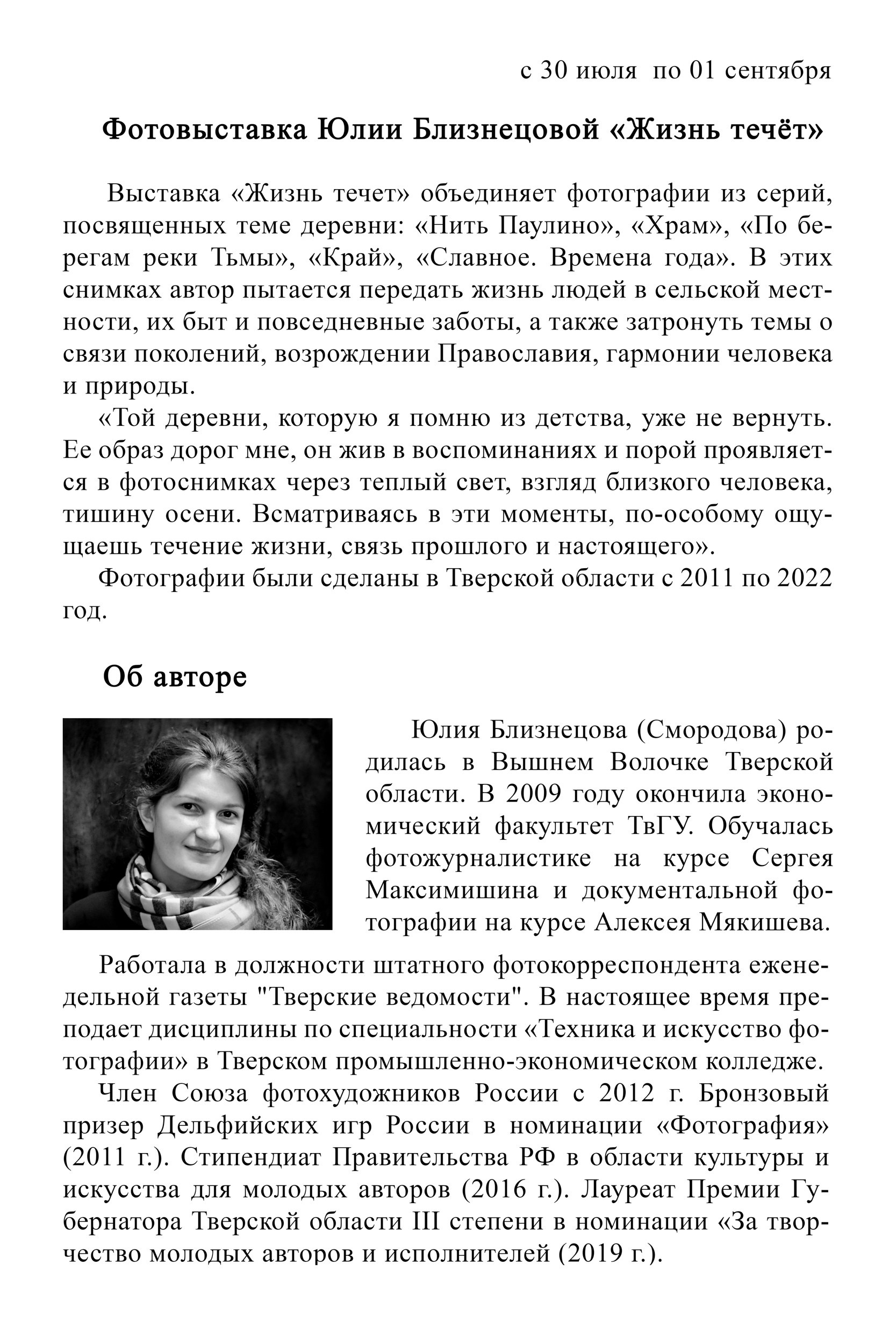 30 июля в ЦКР «Вертикаль» города Пущино открылась персональная фотовыставка «Жизнь течет». Выставка объединила фотографии из серий, посвященных теме деревни: «Нить Паулино», «Храм», «По берегам реки Тьмы», «Край», «Славное. Времена года». В этих снимках автор пытается передать жизнь людей в сельской местности, их быт и повседневные заботы, а также затронуть темы о связи поколений, возрождении Православия, гармонии человека и природы.